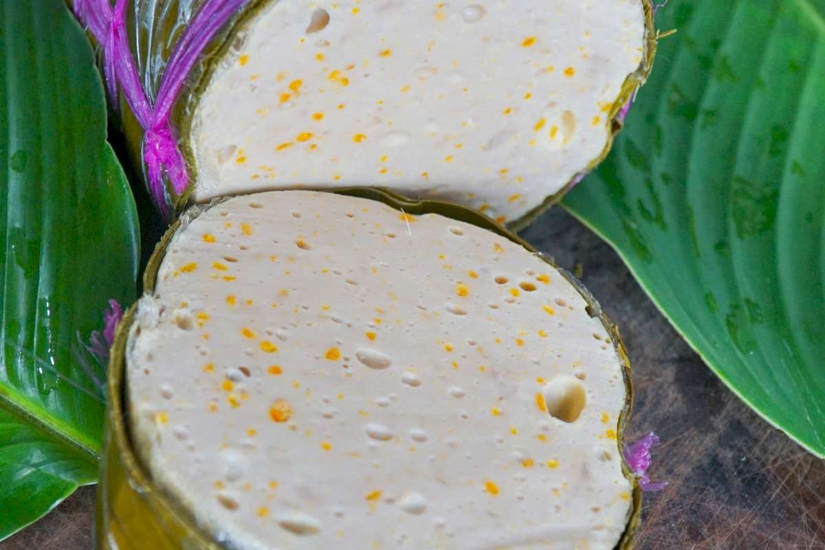 Miếng giò sau khi thái có các sợi Đông trùng hạ thảo được xắt nhỏ màu vàng điểm xuyết bên trong khá thích mắt, mới lạ và hấp dẫn.
