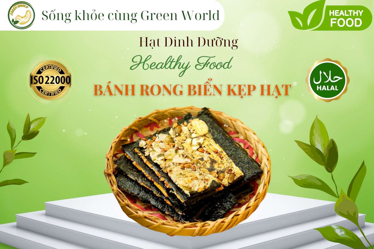 Bánh Rong Biển Kẹp Hạt là món ăn vặt lành mạnh, kết hợp giữa rong biển giòn và các loại hạt dinh dưỡng như hạnh nhân, hạt điều, hạt bí, gạo lứt, mè… thường được nướng hoặc sấy cùng mật ong hoặc mạch nha. Đây là lựa chọn phổ biến cho người ăn kiêng, eat clean, hoặc làm quà tặng dịp lễ Tết.