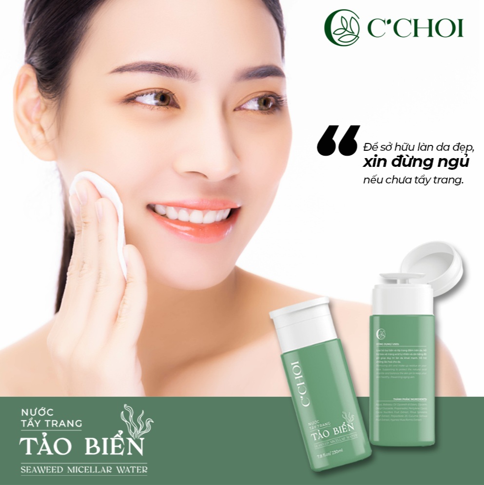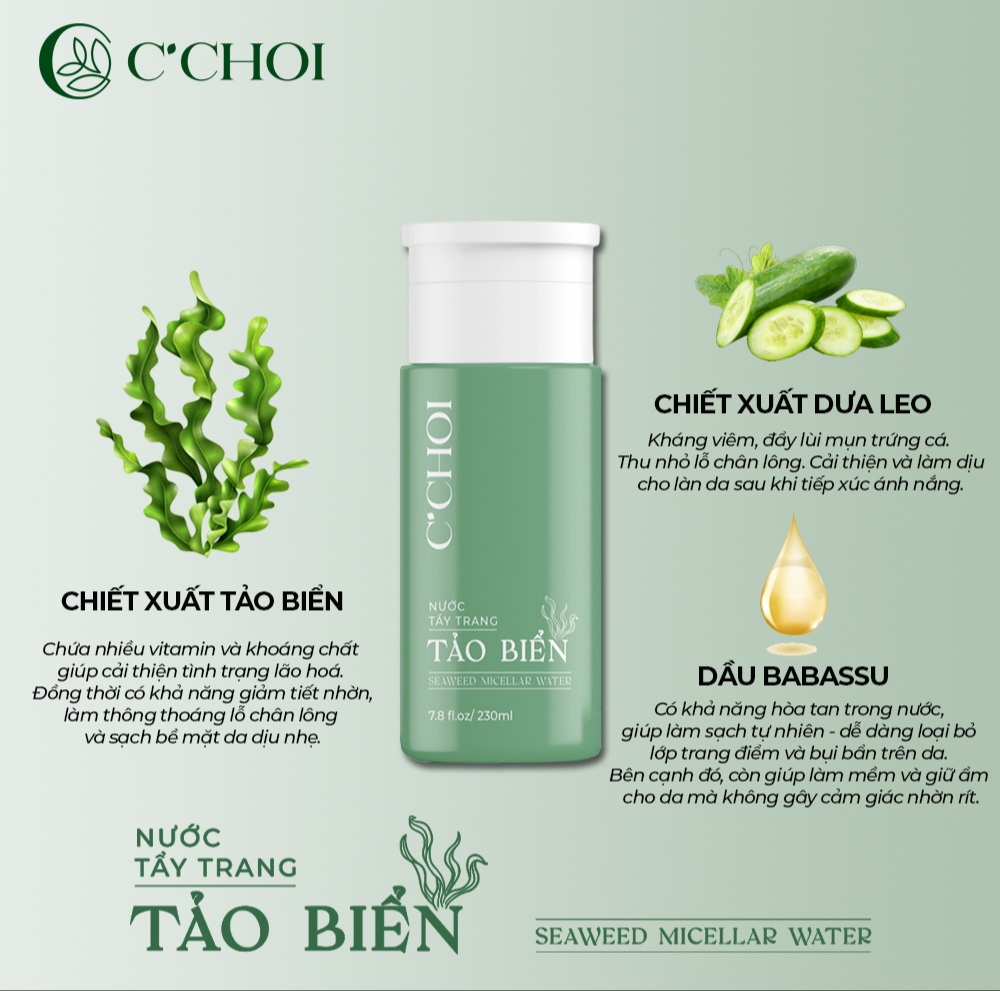 ● Nước Tẩy Trang Tảo Biển - Seaweed Micellar Water là bước đầu tiên thuộc bộ sản phẩm làm sạch của Mỹ phẩm xanh C'Choi, được khuyên dùng kèm với Sữa Rửa Mặt Bọt Khoáng.