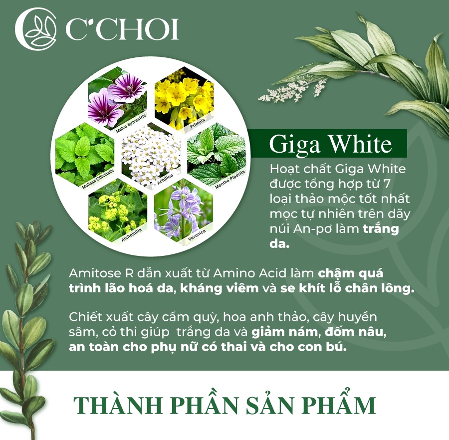 💎 Bên cạnh đó, hoạt chất Giga White được tổng hợp từ 7 loại thảo mộc tốt nhất mọc tự nhiên trên dãy núi An-pơ của Thuỵ Sĩ rất quý hiểm, thậm chí một số loài không có tên tiếng Việt, bao gồm: Chiết xuất cây cẩm quỳ, Mentha, chiết xuất lá bạc hà, chiết xuất hoa anh thảo, Alchemilla Vulgaris Extract, Veronica Officinalis, chiết xuất cây huyền sâm, Melissa Officinalis Leaf Extract, và chiết xuất cỏ thi. Giga White có thể làm trắng da và giảm nám, đốm nâu trên da tuyệt đối an toàn cho phụ nữ có thai và cho con bú.