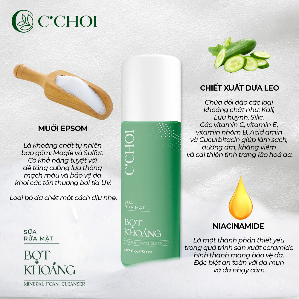 💎 Sữa Rửa Mặt Bọt Khoáng – Mineral Foam Cleanser của Mỹ phẩm xanh C’Choi giới thiệu giải pháp làm sạch da nhẹ nhàng trên tinh thần thư giãn. Cho bạn cảm giác chạm nhẹ và trượt những hạt bọt siêu mịn trên da như một cách làm dịu và loại bỏ bụi bẩn giúp da luôn thông thoáng vào cuối ngày.