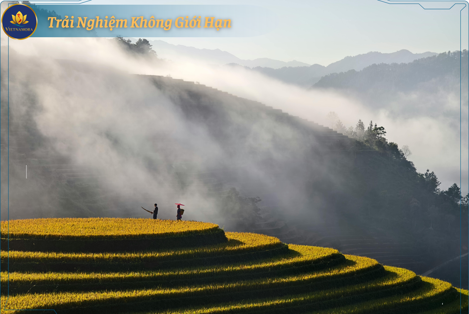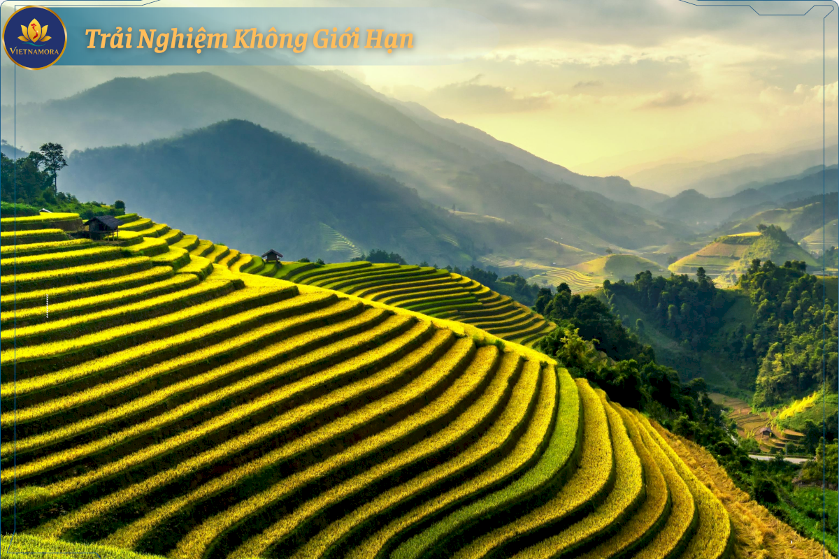 Xa xa, những nếp nhà sàn của đồng bào Xê Đăng ẩn hiện giữa màu lúa chín, khói lam chiều tỏa lên từ bếp nhỏ tạo nên khung cảnh yên bình hiếm nơi nào có được. Di sản ruộng bậc thang nơi đây ví như bản tình ca mùa vàng - nơi con người hòa cùng thiên nhiên trong niềm vui no ấm.